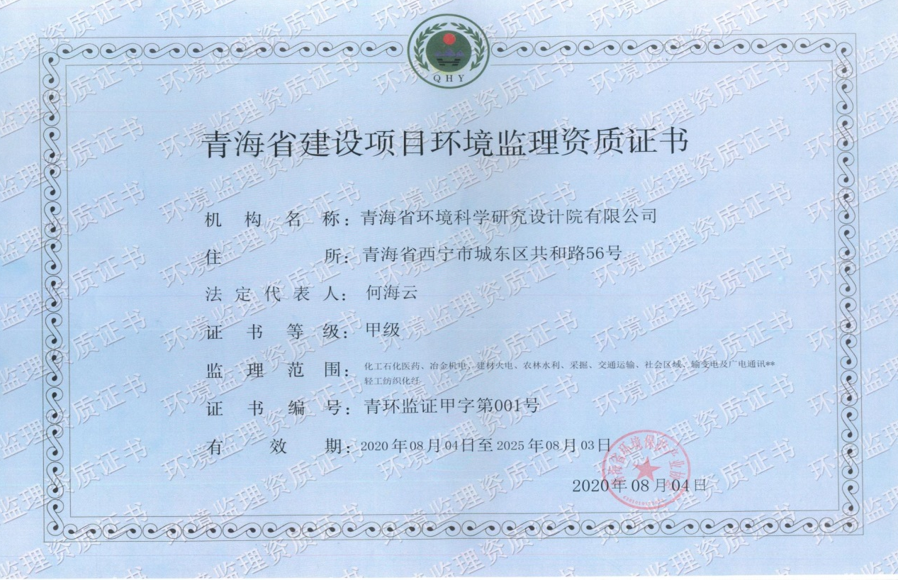 《青海省建設項目環(huán)境監(jiān)理資質證書》,甲級資質,青海省環(huán)境保護產業(yè)協(xié)會頒發(fā),2020年8月4日