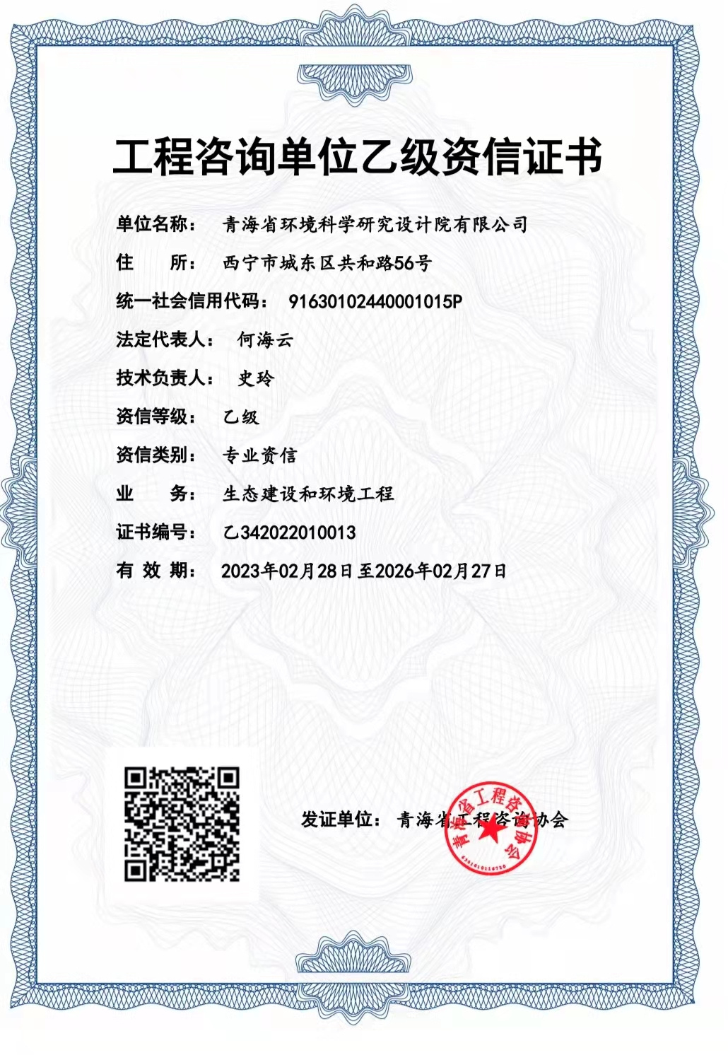 《工程咨詢單位乙級資信證書》,青海省工程咨詢咨詢協(xié)會頒發(fā),2023年2月8日