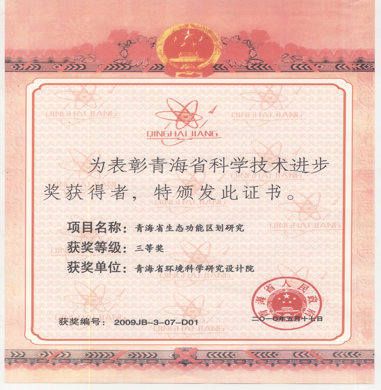 青海省科學技術進步獎三等獎,青海省人民政府頒發(fā),2010年5月17日